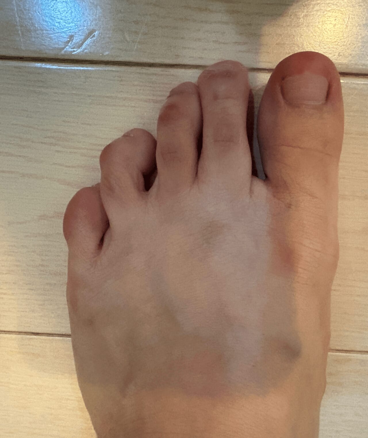 ご記載の内容から判断すると、扁平足に伴う足のアーチ構造の崩れが、現在の指の曲がりに関与している可能性が考えられます。